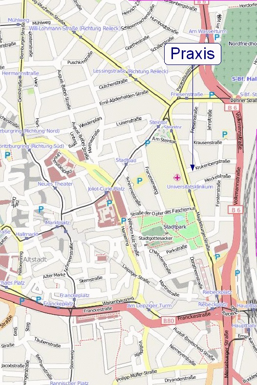 Lagebeschreibung meiner PraxisMeine Praxis liegt im weiteren Innenstadtbereich in der Nähe der alten Universitätskliniken neben der ehemaligen Orthopädischen Klinik „Martha Maria“. An der Haltestelle Magdeburger Straße zwischen Riebeckplatz (Hauptbahnhof mit S-Bahn-Haltestelle) und Steintor halten folgende Linien der Straßenbahn: Linie 2 Linie 5 Linie 12 Nach ca. 100 m Fußweg gelangen Sie in meine Praxis. Falls Sie den PKW benutzen, beachten Sie bitte, daß es sich bei der Krukenbergstraße um eine Sackgasse handelt. Bei Anfahrt aus Richtung Steintor müssen Sie in die Krausenstraße einbiegen. Sollten Sie aus Richtung Riebeckplatz anfahren, können Sie über die Halberstädter- und Forsterstraße oder auch über die Krausenstraße in die Krukenbergstraße gelangen. gebührenfreie Parkplätze Gesamtes Wohngebiet zwischen Magdeburger und Volkmannstraße gebührenpflichtige Parkplätze